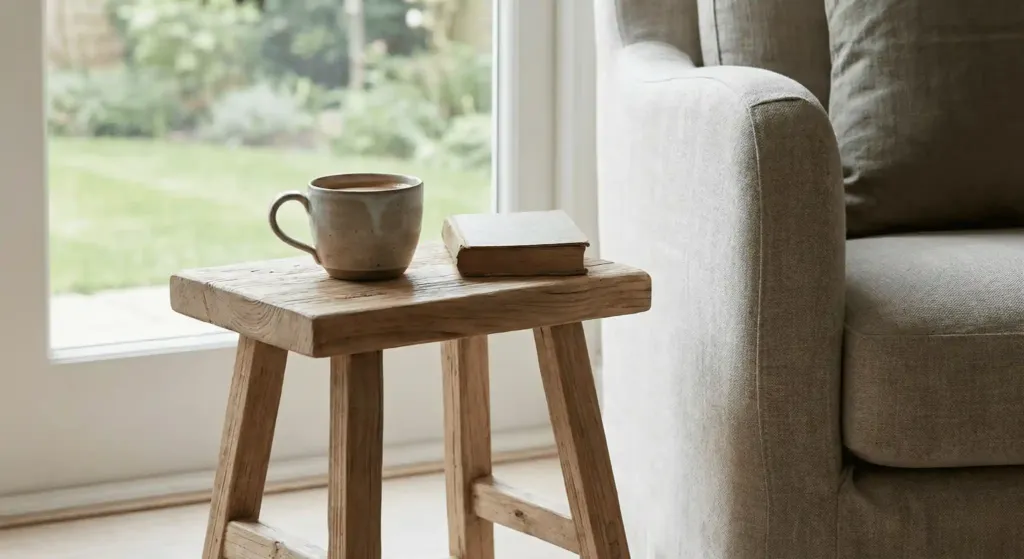 I found a raw wood stool at a local flea market for 15 dollars. I sanded it down and left it natural. I use it as a side table for my coffee. It adds a “wabi-sabi” feel to the space. You can also add wood beams to the ceiling if you have the budget. This costs around 2,000 to 5,000 dollars but adds massive value to your home. [Internal Link: How to style a wooden coffee table].