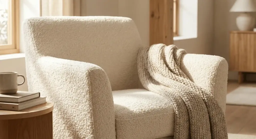 I tested a bouclé chair from CB2 last year. It feels like sitting on a teddy bear. Even in a pale cream color, the texture makes it stand out. It hides small crumbs well because of the loops. However, be careful if you have cats. Their claws can snag the loops easily. If you have pets, look for a “performance bouclé.”