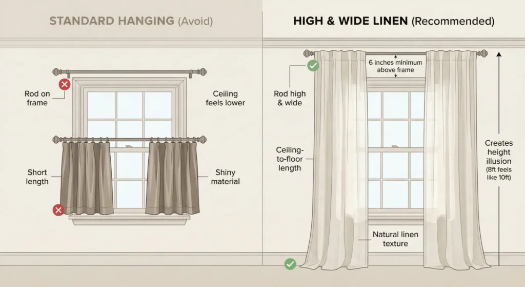Linen allows soft light to filter through. It has a natural wrinkle that looks relaxed. Hang your curtain rod 6 inches above the window frame. This makes your ceilings look much taller.