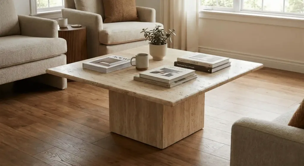 Marble, travertine, or limestone tables add a cold texture that balances warm woods. The natural veining in stone provides a subtle pattern. This keeps the room from looking too perfect.