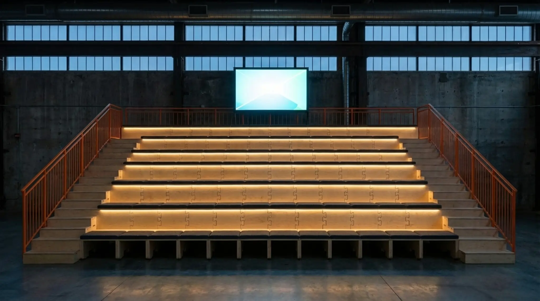 Nexus AI needed 150-seat stadium seating without pouring concrete in their leased warehouse. We engineered interlocking plywood ribs saving $40,000 in welding costs, simulated sightlines to eliminate bad views, and designed acoustic cavities.