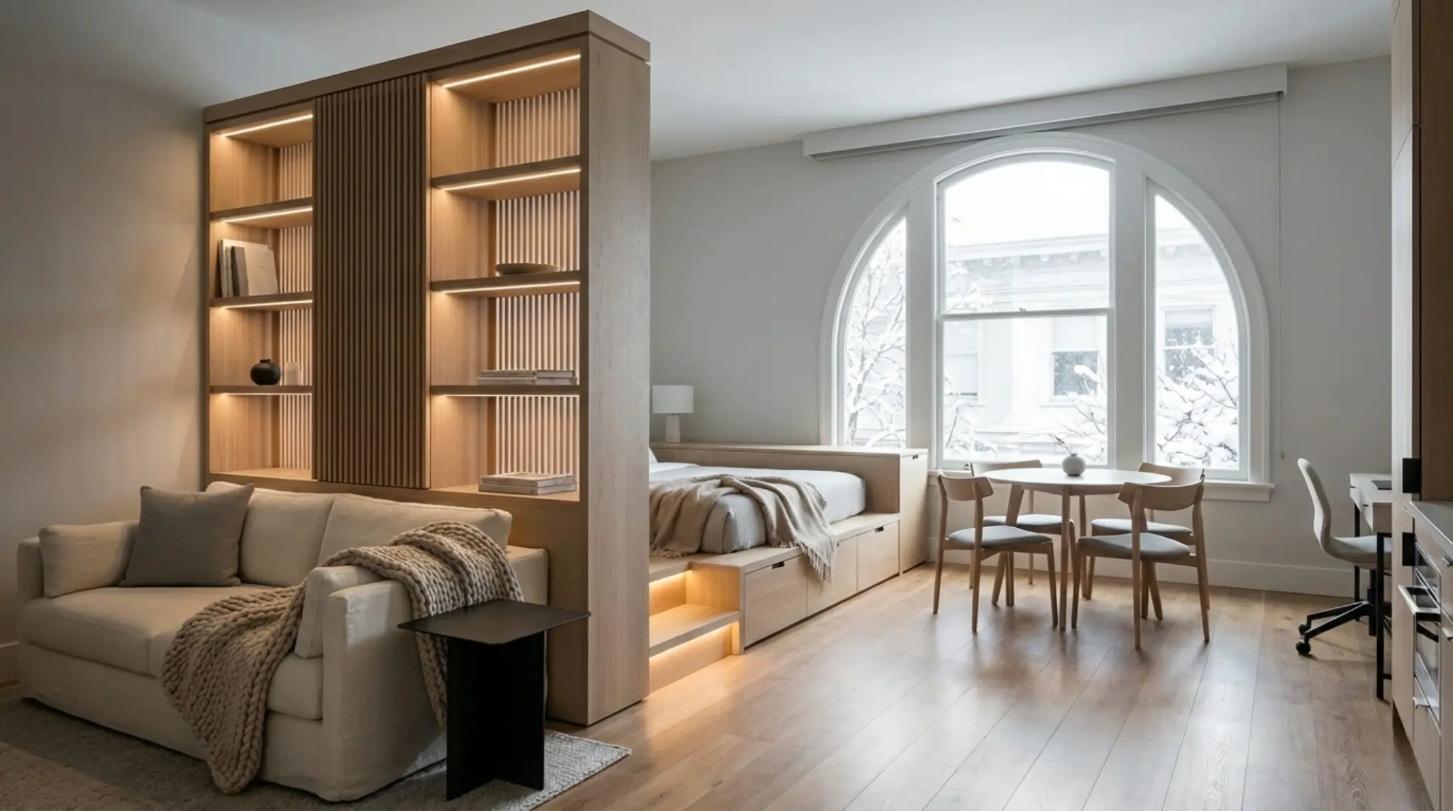 Alex Chen’s 650-square-foot studio lacked defined zones and felt cramped. We designed custom dual-purpose millwork, a bookshelf/wardrobe divider, and a raised sleeping platform with hidden storage. Using a strict Japandi palette, we created a fully functional home with dedicated workspace, dining, and bedroom areas.