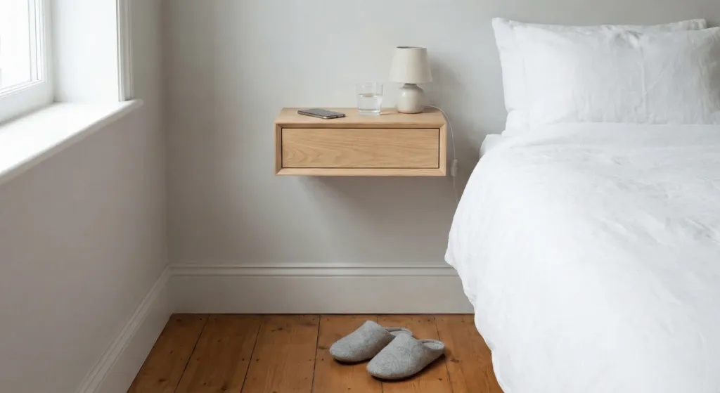 Floor space is the most valuable currency in a small room. Standard nightstands with legs create visual clutter. They block the sightline where the floor meets the wall. This makes the room feel smaller. I replaced my bulky mahogany tables with two floating oak shelves. The change was instant.
