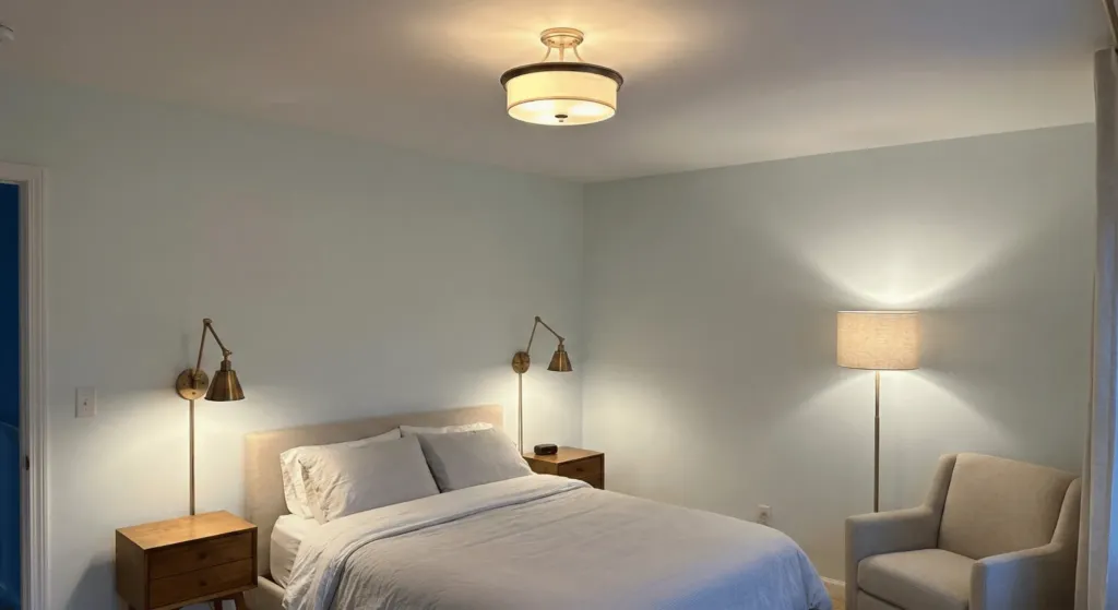Dark corners shrink a room. A single overhead light is the worst thing for a small bedroom. it creates harsh shadows. I use a three layer lighting plan. One overhead (dimmable), two bedside sconces, and one floor lamp.