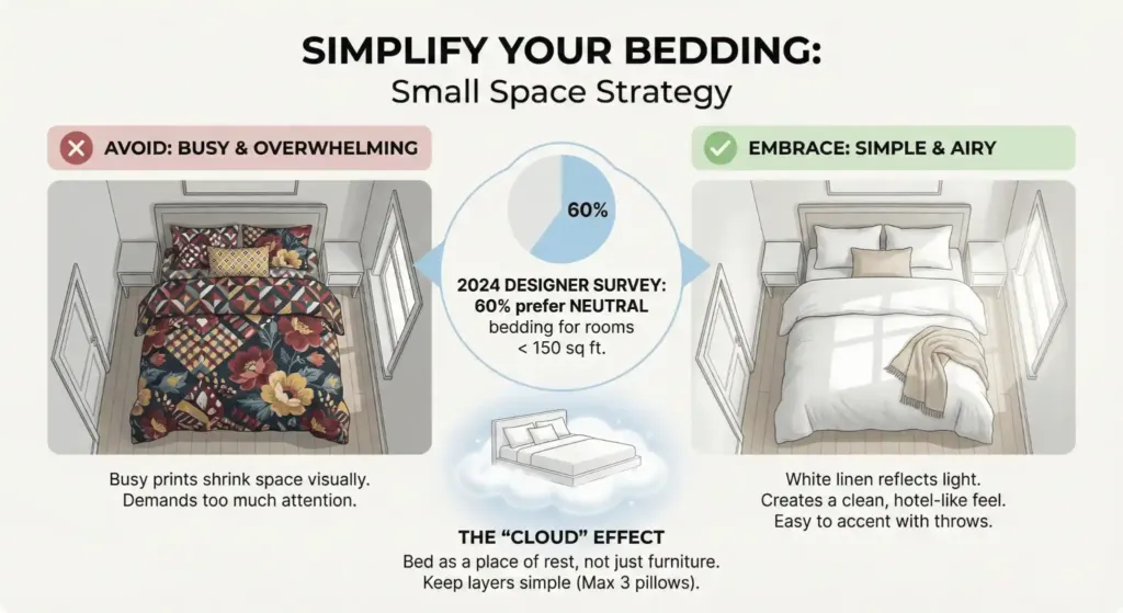 White bedding feels like a hotel. It looks clean and airy. It reflects light. If you want color, use it in the pillows or a small throw. This allows you to change the look easily without repainting.