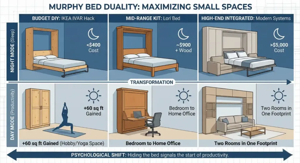 If you are on a budget, look at the IKEA IVAR hack. You can build a fold down bed for under $400. One client, Mark, used this in his 120 square foot room. He gained sixty square feet of hobby space. He now practices yoga in the spot where his bed used to sit. The psychological relief of “hiding” the bed is immense. It signals the end of sleep and the start of productivity.