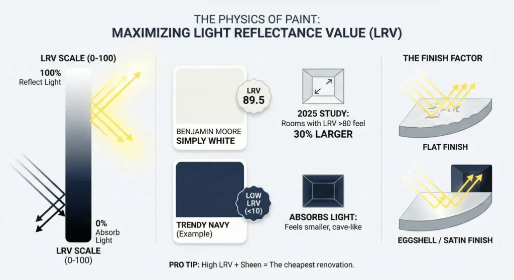 I recommend Benjamin Moore Simply White. It has an LRV of 89.5. This means it reflects nearly ninety percent of the light hitting it. In a 2025 study of small interiors, rooms with LRV scores above 80 felt thirty percent larger to participants.