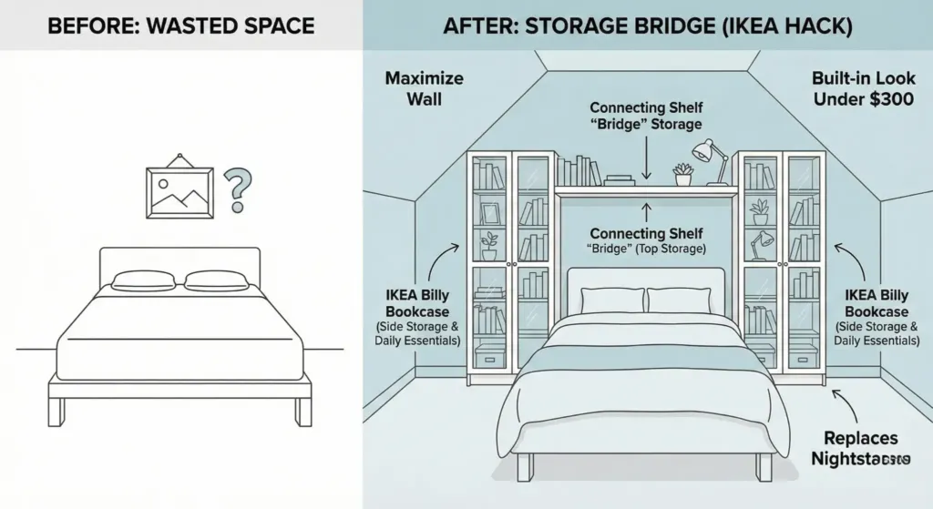 The wall behind your headboard is often wasted. People hang a single picture and call it done. I prefer building a “bridge” of storage. Use IKEA Billy bookcases on either side of the bed. Connect them with a shelf across the top.
