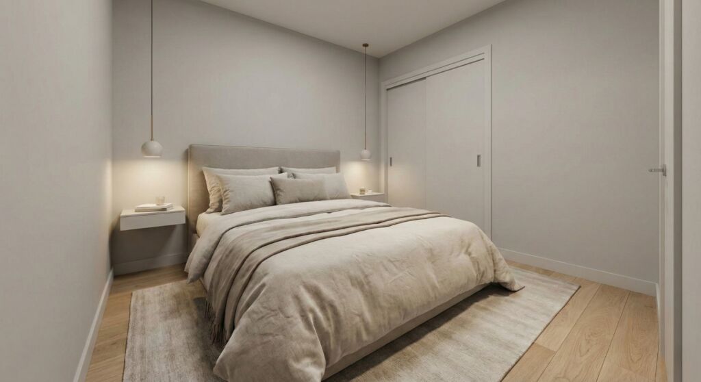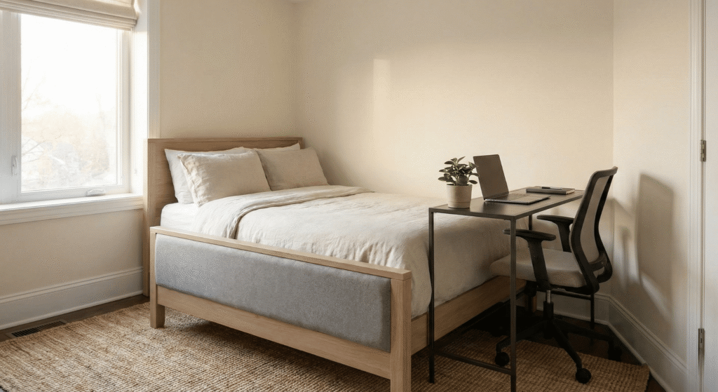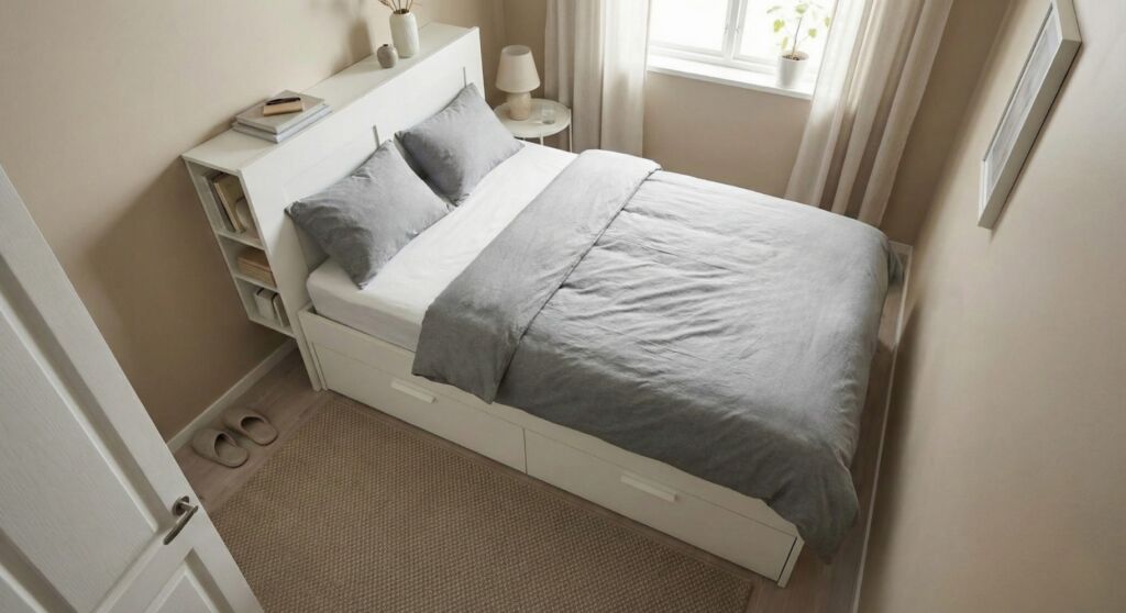This is the most common starting point for a tiny room. You push the head of the bed into a corner so two sides touch the walls.