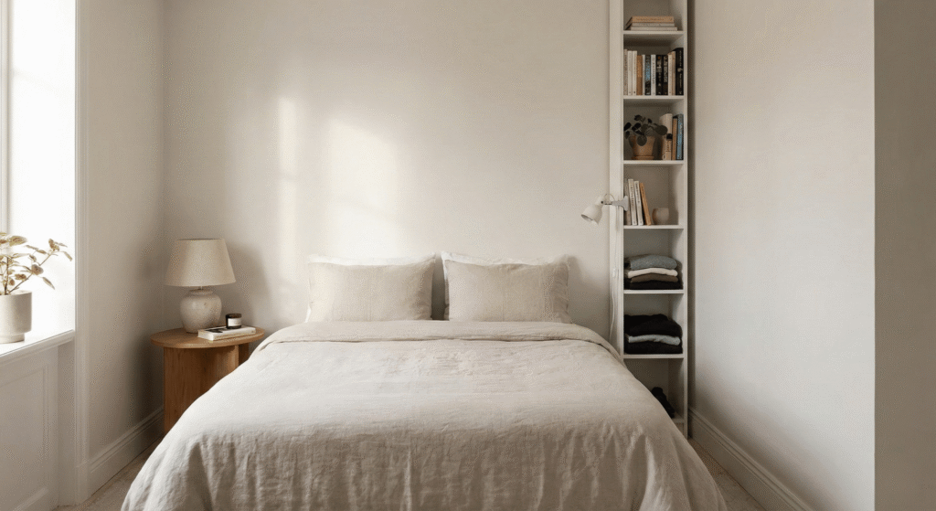 The bookshelf provides vertical storage for books and clothes while still offering a surface for a lamp. This maximizes the utility of that 12-inch gap between the bed and the wall.