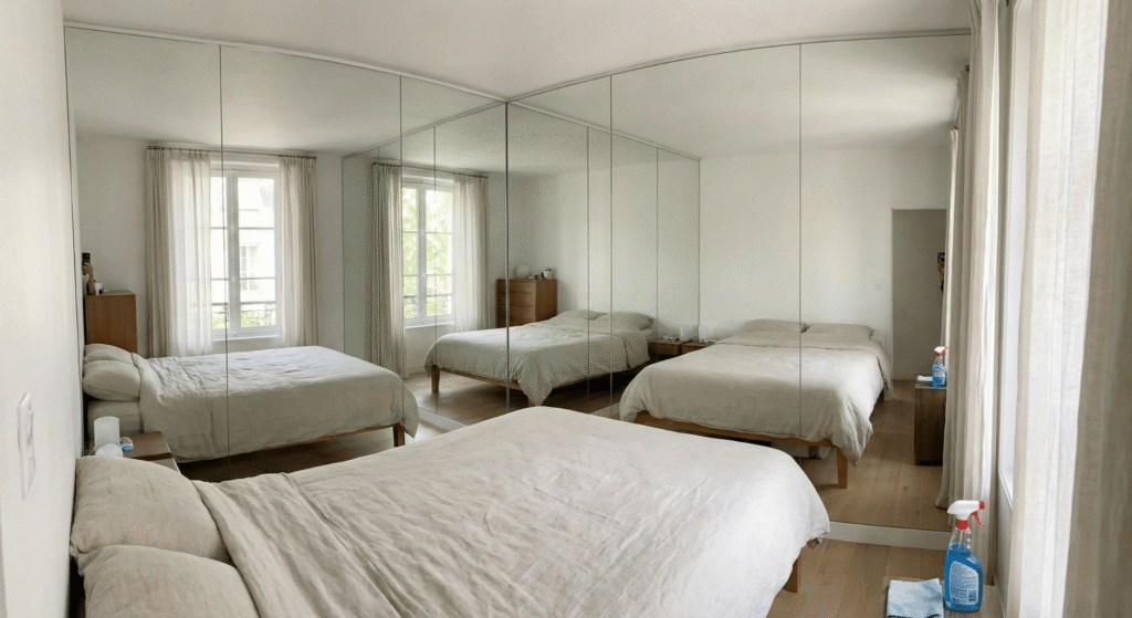 I once lived in a room with mirrored closet doors. While it made the room look huge, it was a lot of glass to keep clean. Use a high-quality glass cleaner every week to avoid a “grimy” feel.