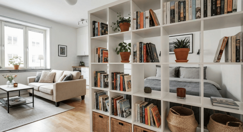 Use a kallax-style open bookshelf as a divider.