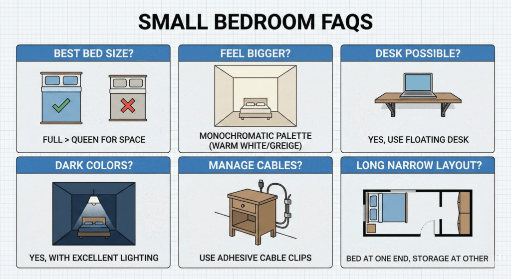 Use adhesive cable clips along the back of your bed frame or nightstand. Visible cables create visual “noise” that makes a small space feel messy.