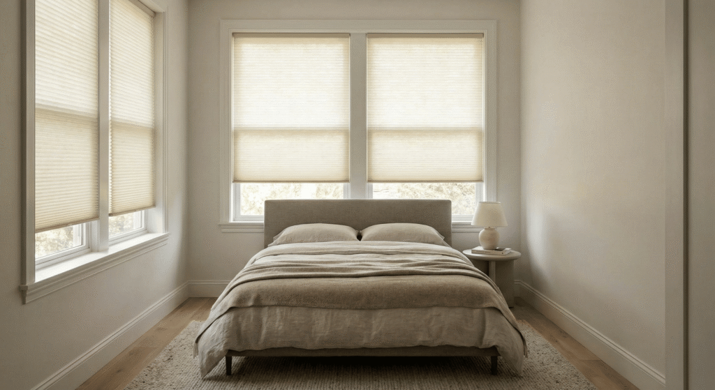 Cold drafts and morning light. In 2024, I helped a client in Chicago with this layout. We used heavy cellular shades and a low-profile headboard. The headboard was short enough that it did not block the glass.