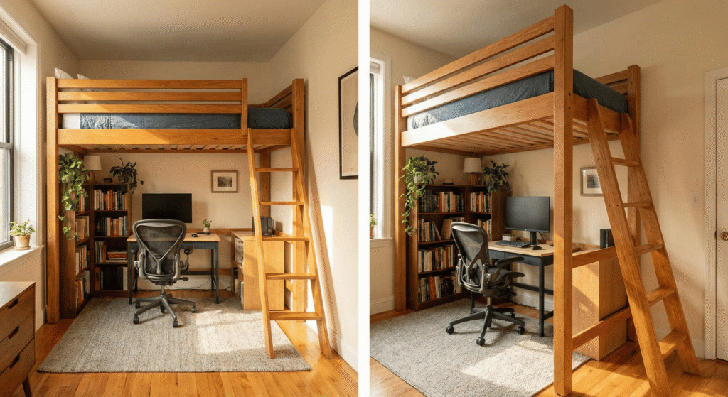 It opens up the maximum amount of floor space. By tucking the bed away, you create a central “living” area in the room. This makes a 100-square-foot room feel like it has actual walking paths.