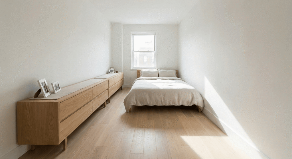 A long, low dresser draws the eye horizontally. This makes the room feel wider than it is.