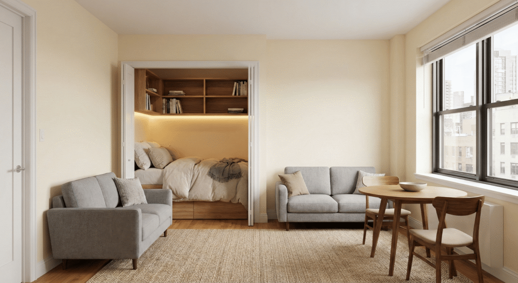 By 2027, I expect to see more “robotic” furniture in the mainstream market. Companies like Ori are already creating walk-in closets that slide across the room at the touch of a button. For now, we must rely on smart layout principles.