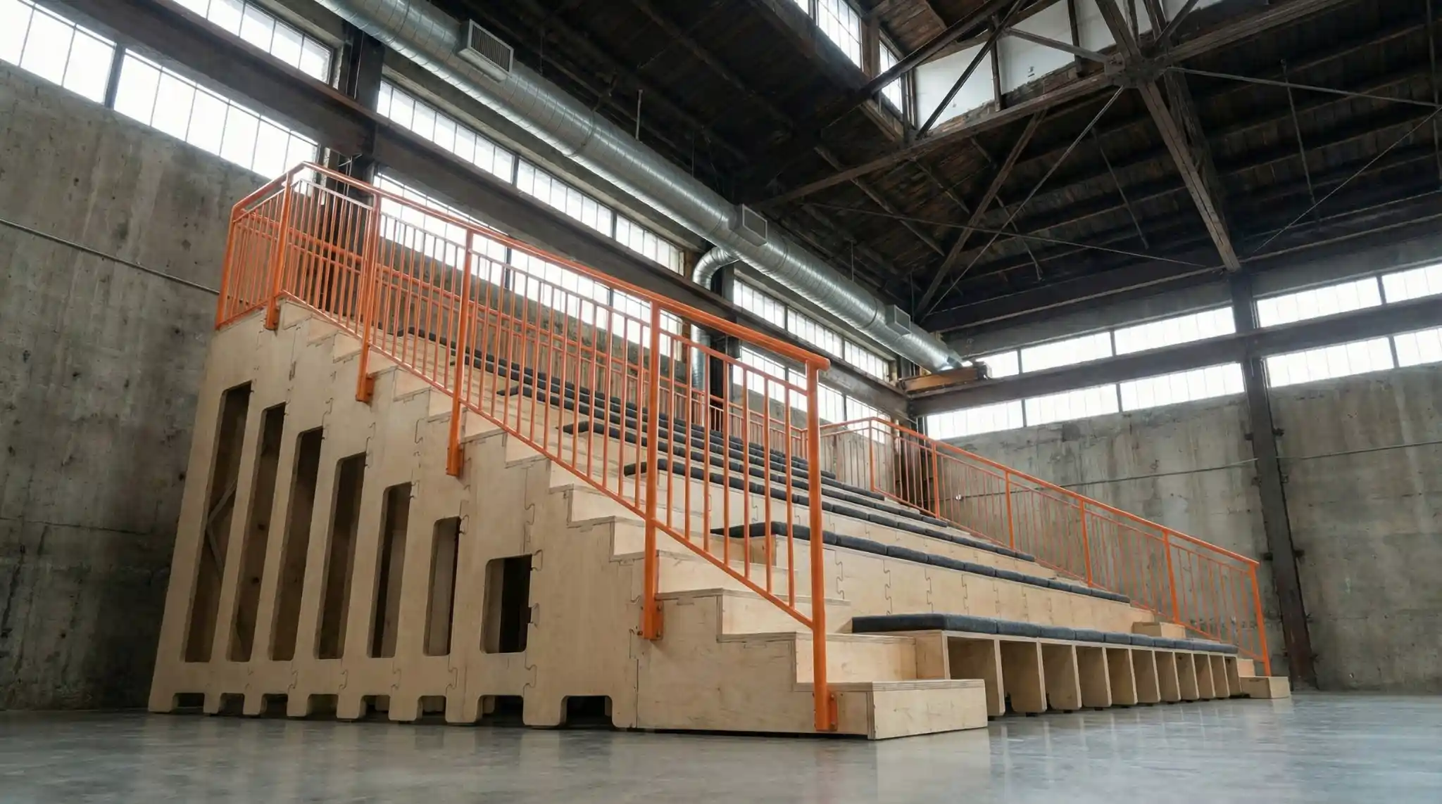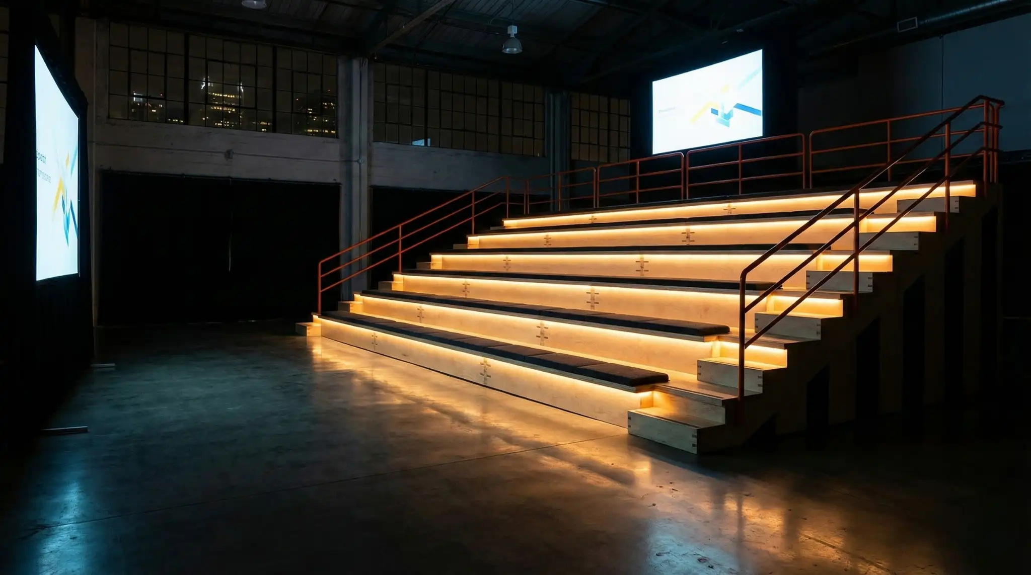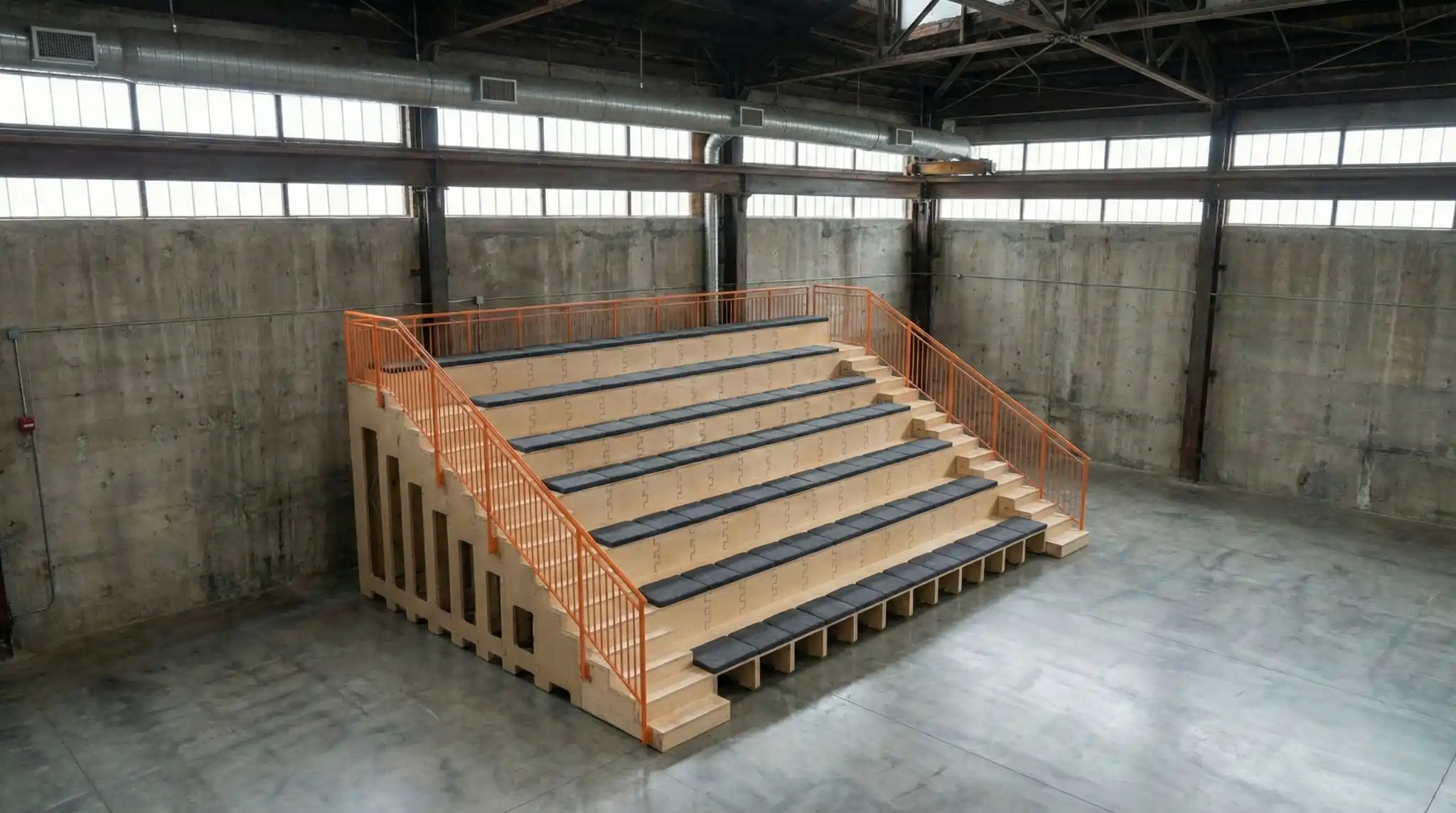 A rapid-growth AI startup in the Dogpatch secured a warehouse space with soaring 25-foot ceilings. They needed a central Town Hall space for weekly all-hands meetings for 150 employees, but they hated the idea of folding chairs. They wanted a permanent, architectural seating solution that doubled as a casual lounge during the week. The challenge was structural: creating a tiered stadium seating structure that was self-supporting, modular in case they moved, and did not require pouring concrete foundations inside a leased building.