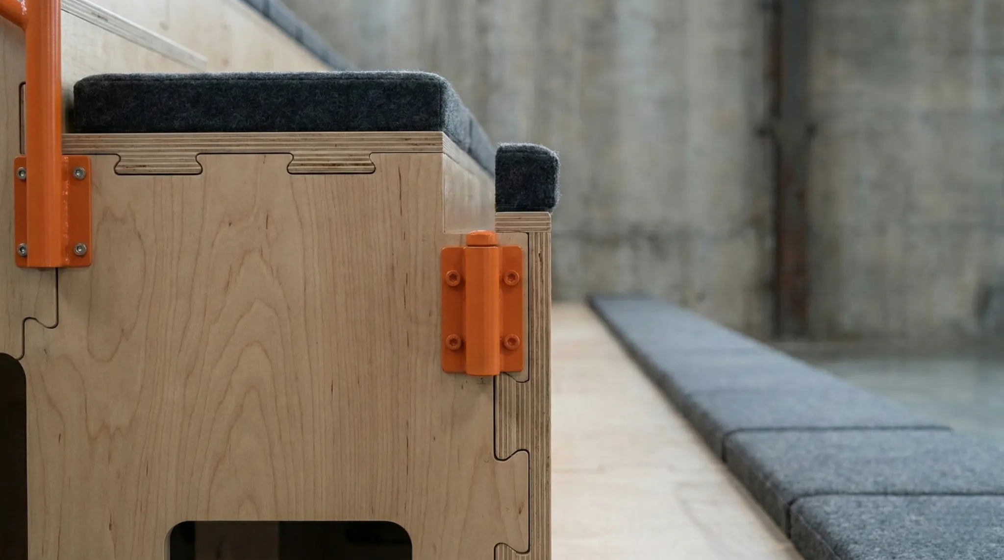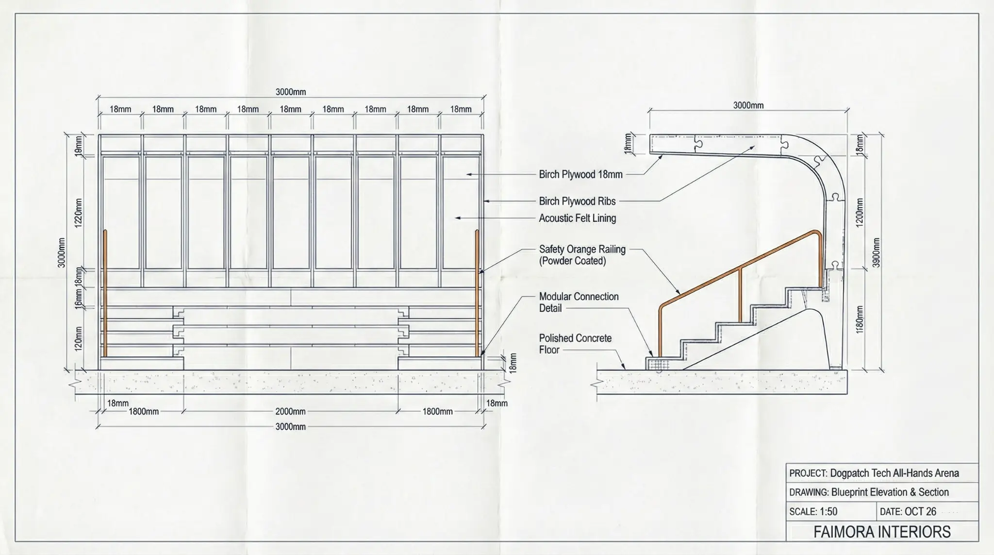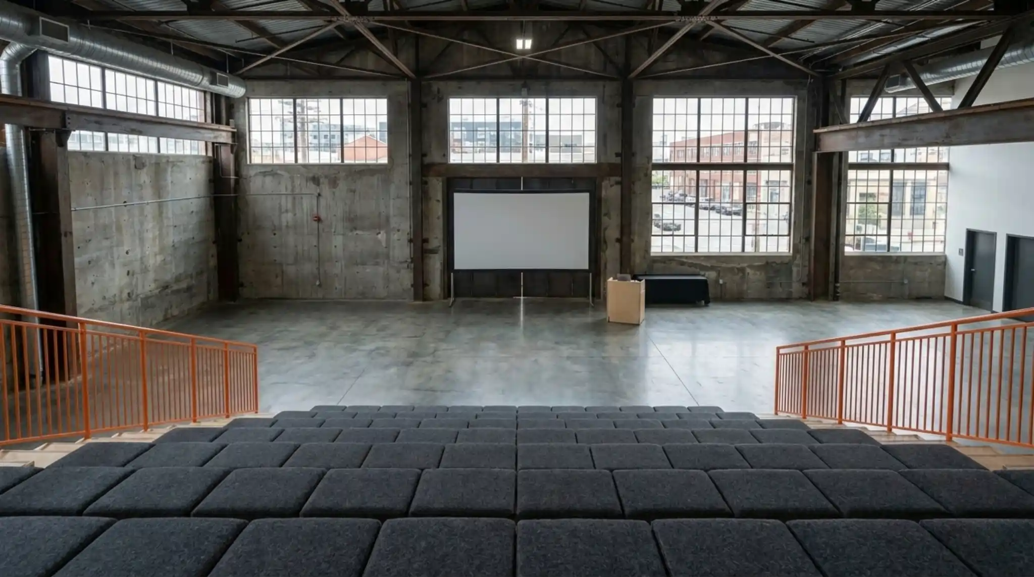 A rapid-growth AI startup in the Dogpatch secured a warehouse space with soaring 25-foot ceilings. They needed a central Town Hall space for weekly all-hands meetings for 150 employees, but they hated the idea of folding chairs. They wanted a permanent, architectural seating solution that doubled as a casual lounge during the week. The challenge was structural: creating a tiered stadium seating structure that was self-supporting, modular in case they moved, and did not require pouring concrete foundations inside a leased building.