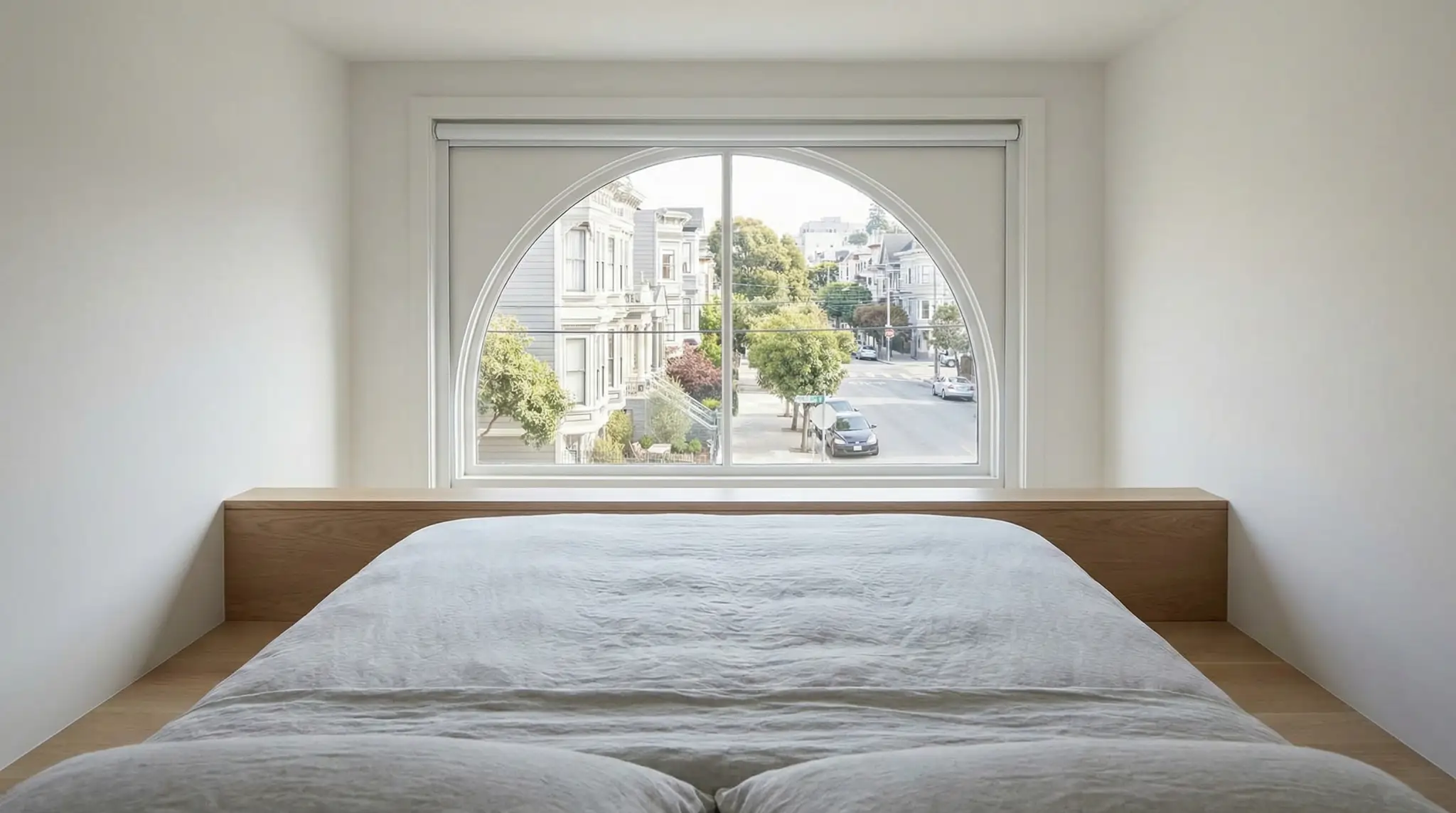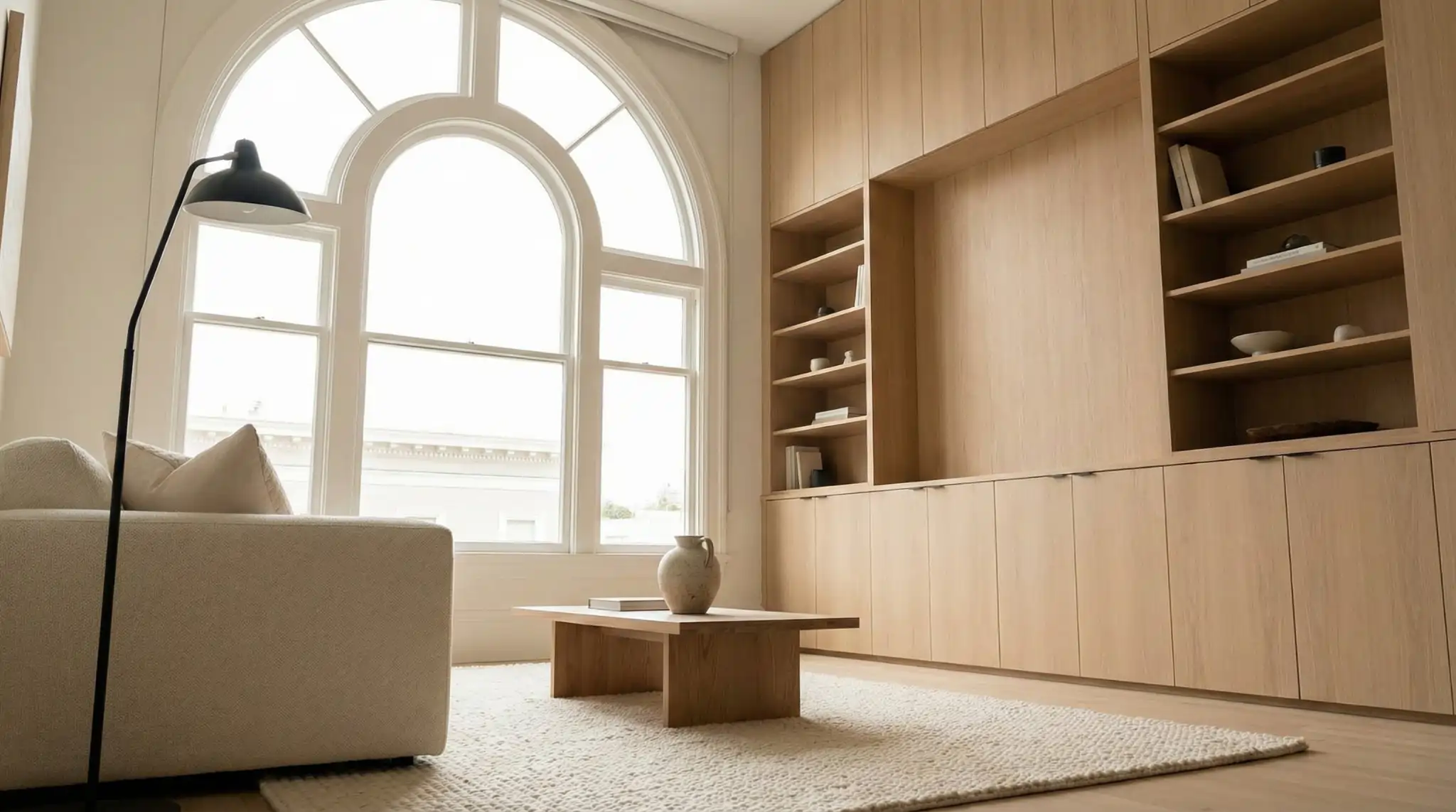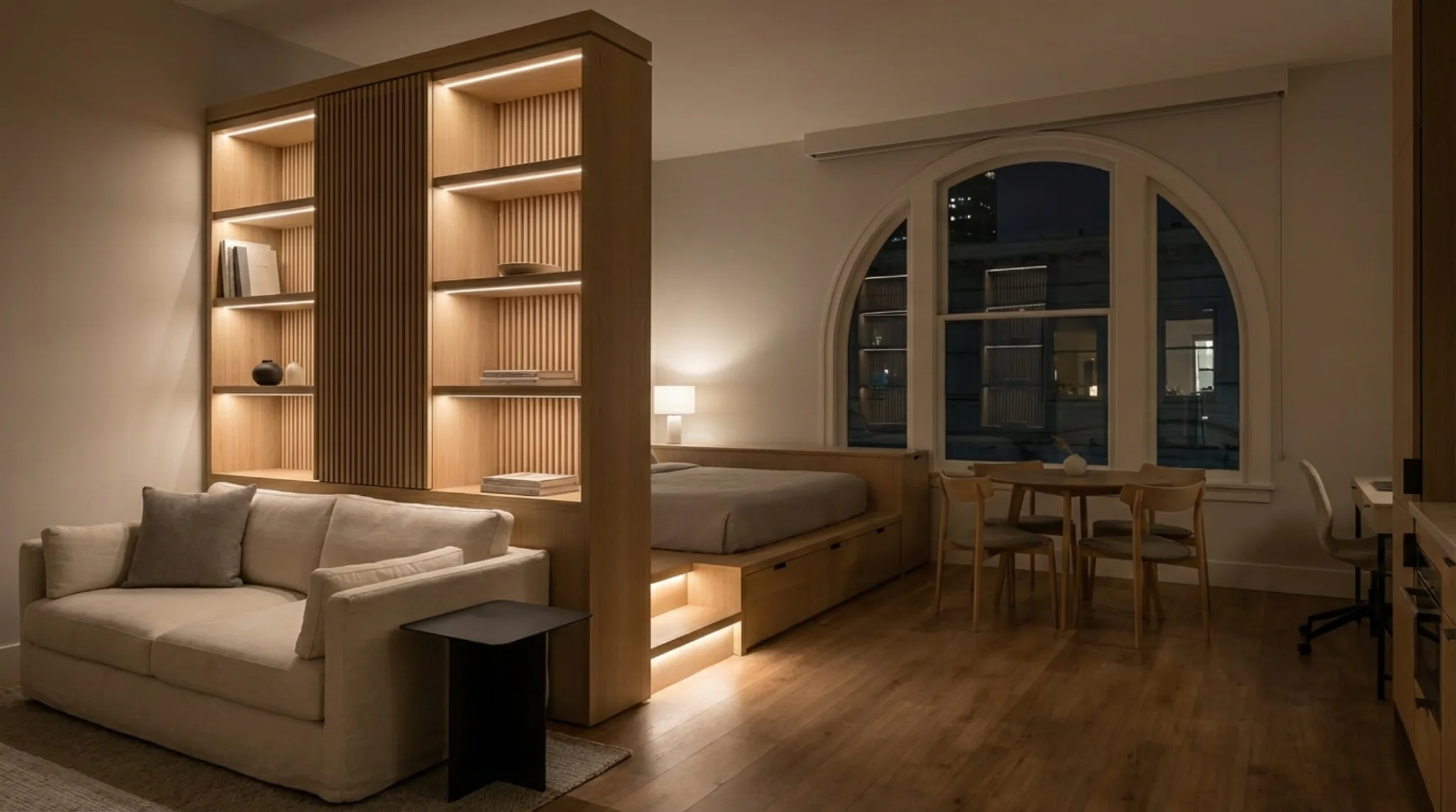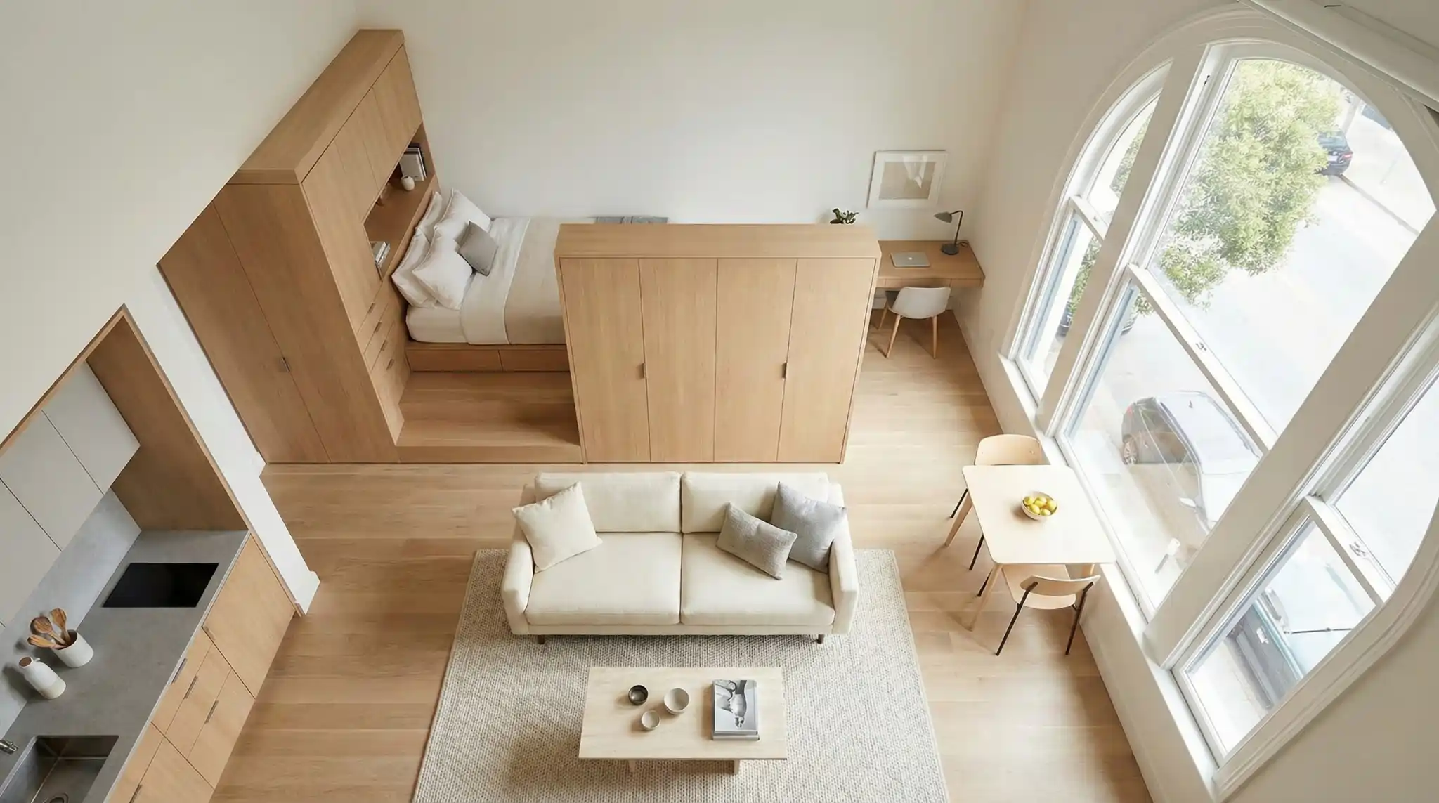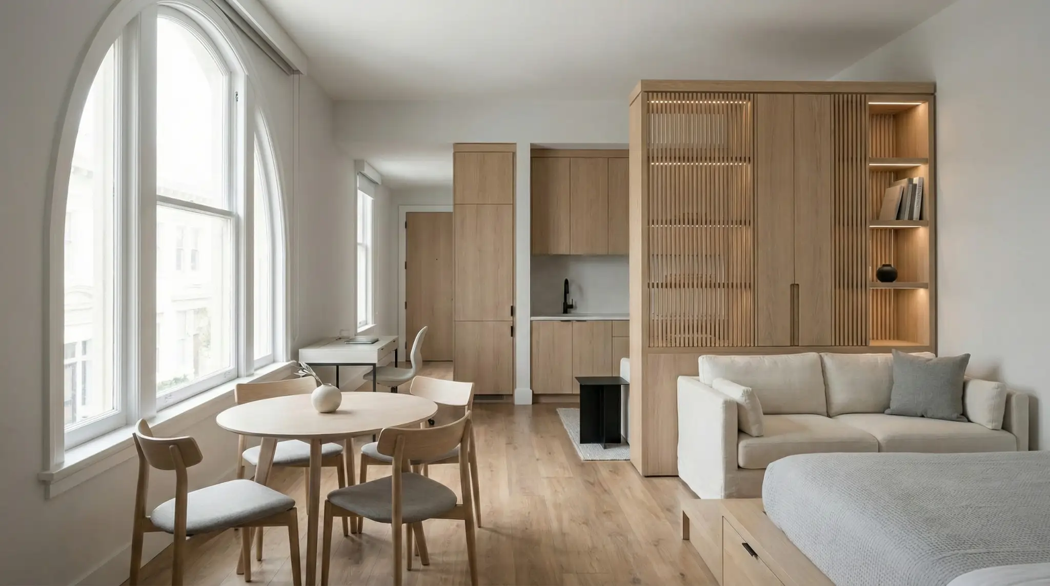 Living in Hayes Valley often means compromising on square footage for the sake of location. Our client, a young tech executive, purchased a 650-square-foot studio loft that felt cramped and lacked defined living zones. The bedroom was just a mattress on the floor in the corner, and the client felt like they were living in a college dorm rather than a luxury apartment. The client wanted a Japandi aesthetic, minimalist, warm, and highly functional. The challenge was to create a fully functional home that included a dedicated workspace, a dining area for four, and a separation between sleeping and living, all without erecting walls that would block the single source of natural light.