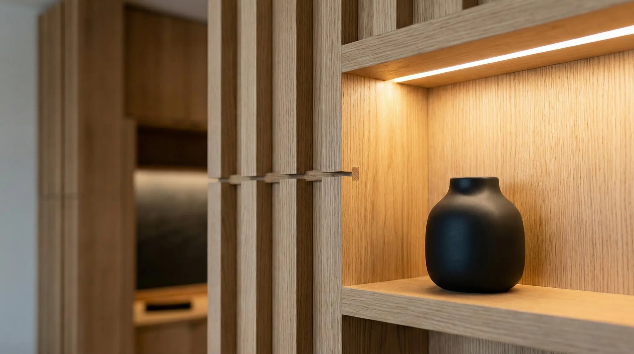 In a studio, every object must do two jobs. We detailed custom cabinetry that acts as a room divider. It defines the entryway from the living space while offering open shelving for display on the left and closed cabinets for utility storage on the right.