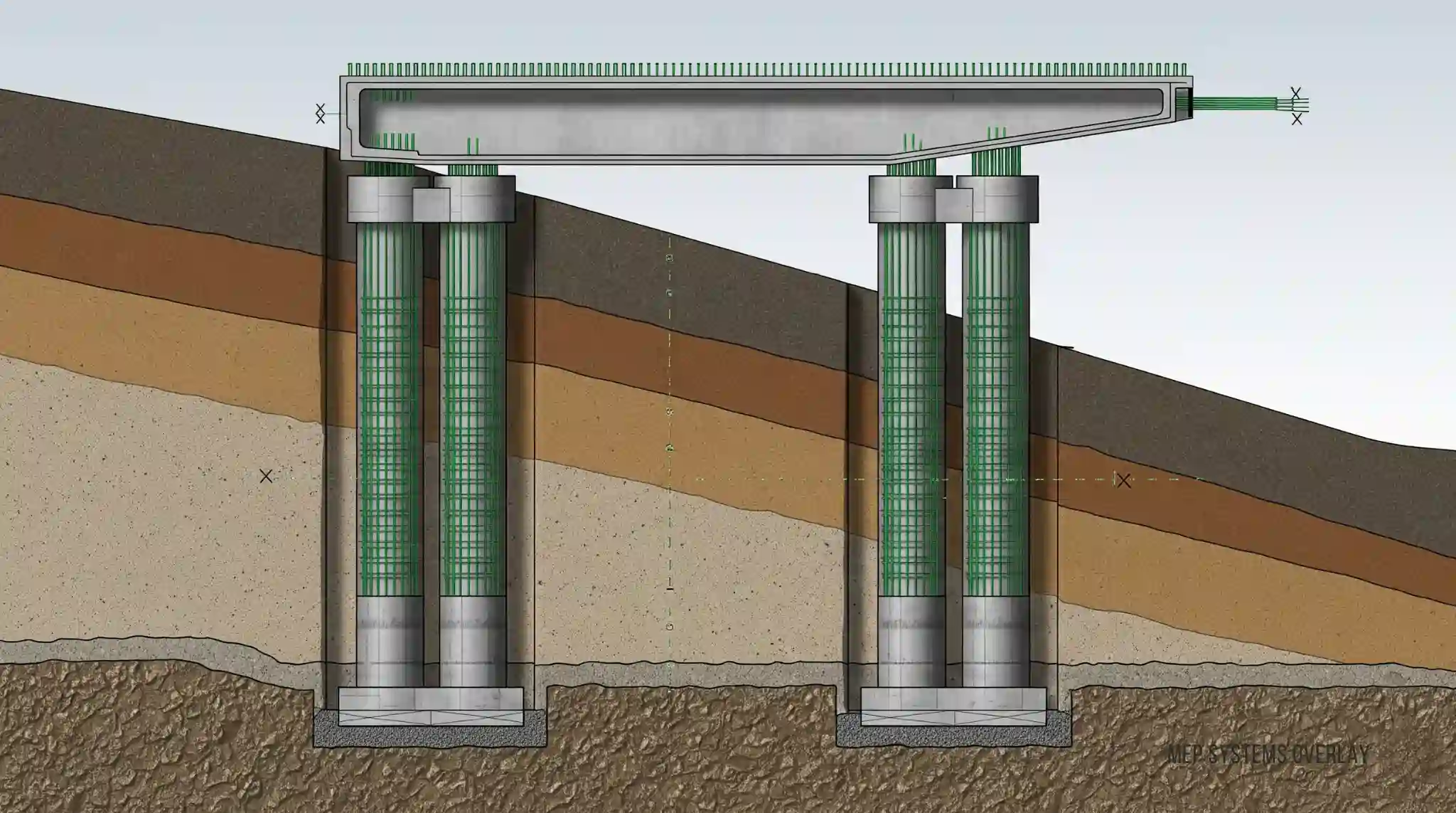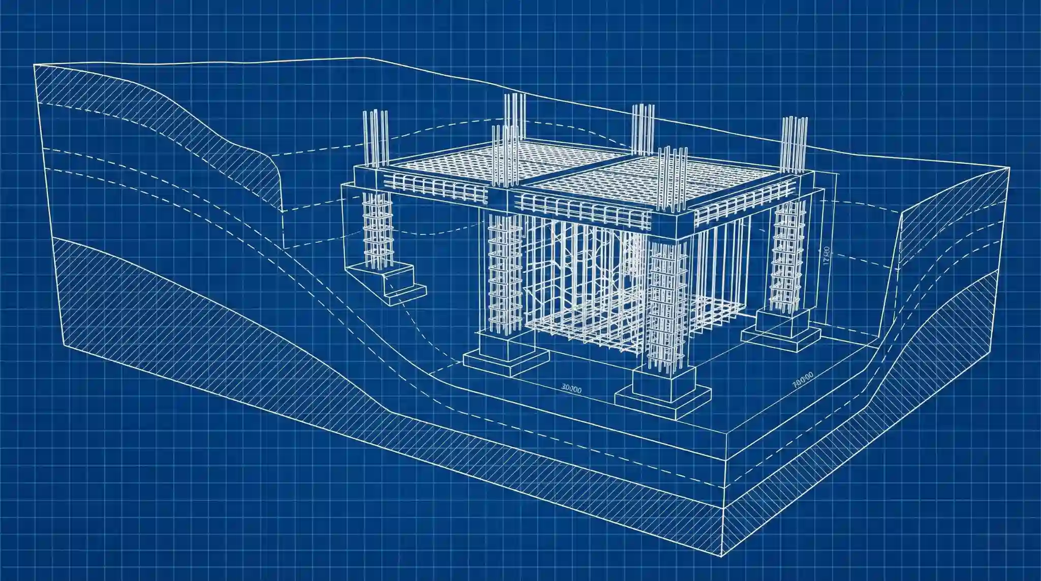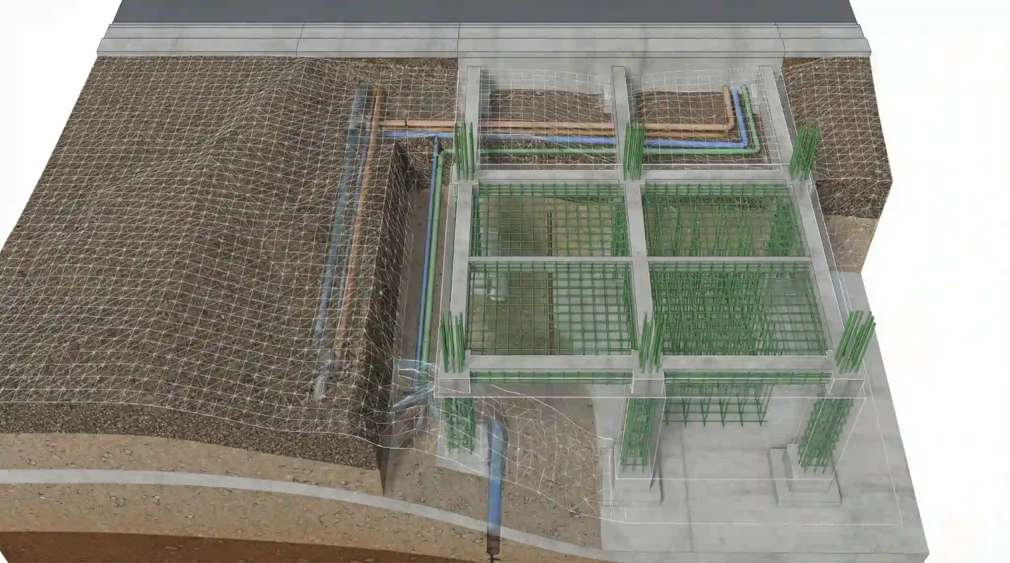 Using the engineering CAD files, we modeled the subterranean geology and the concrete foundation structure in 3D. We created a transparent terrain mesh that showed exactly where the concrete piers needed to penetrate the bedrock. We color-coded the varying depths of the grade beams, providing a clear visual map for the excavation team. We even modeled the rebar cages for the most complex intersections to prove that the steel could actually fit within the concrete forms. This model was uploaded to the foreman iPad, serving as the daily reference guide for the drilling crew.