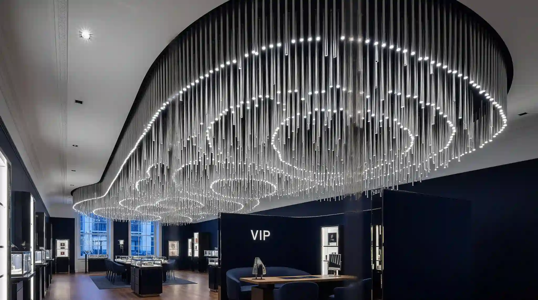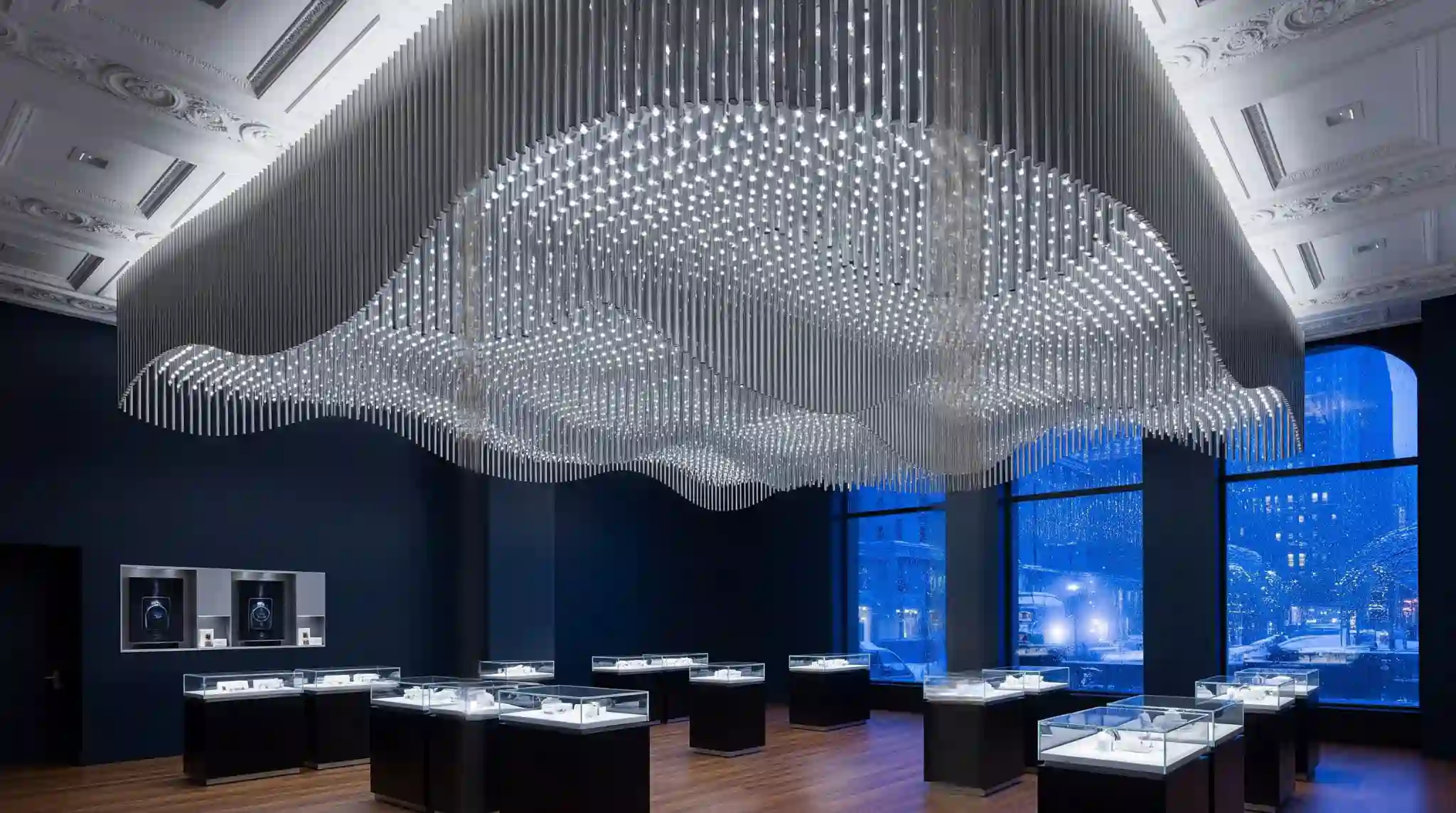 Retail in Union Square is about spectacle. A luxury watch brand needed a flagship store design that would stop pedestrians in their tracks. The lease had a restrictive no attachment clause for the historic plaster ceiling, meaning we could not hang heavy chandeliers. The client wanted a floating cloud lighting installation that felt ethereal and high-tech. The challenge was designing a massive, intricate structure that was lightweight enough to be supported by minimal anchor points yet rigid enough not to sag.