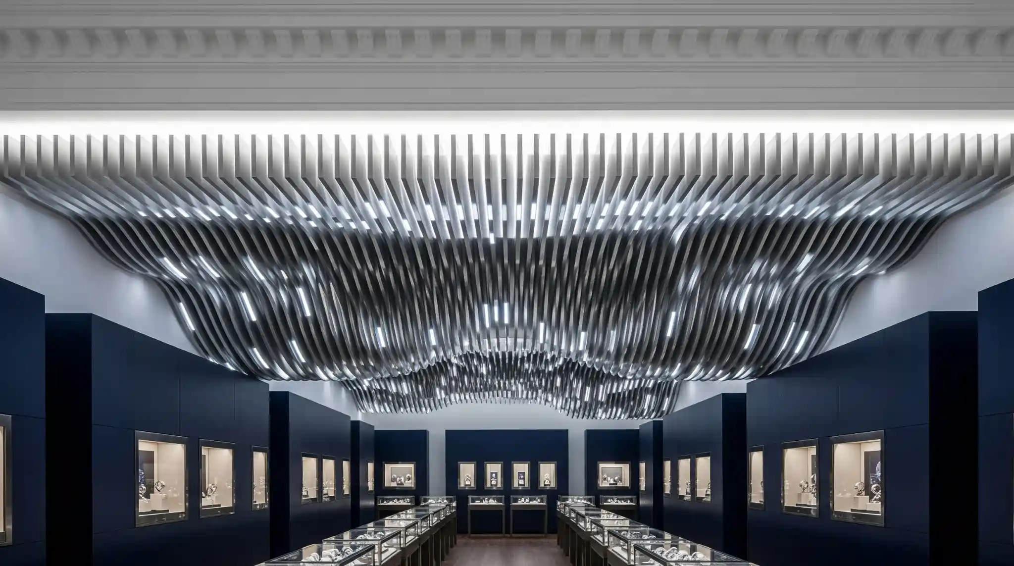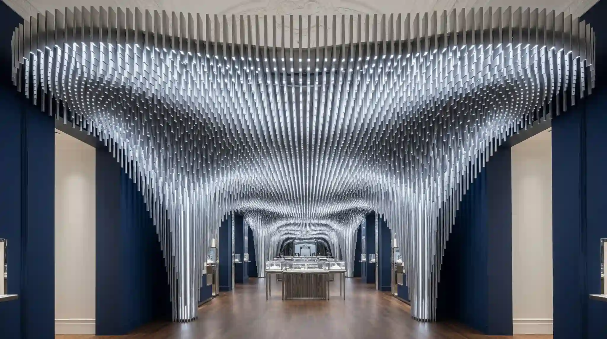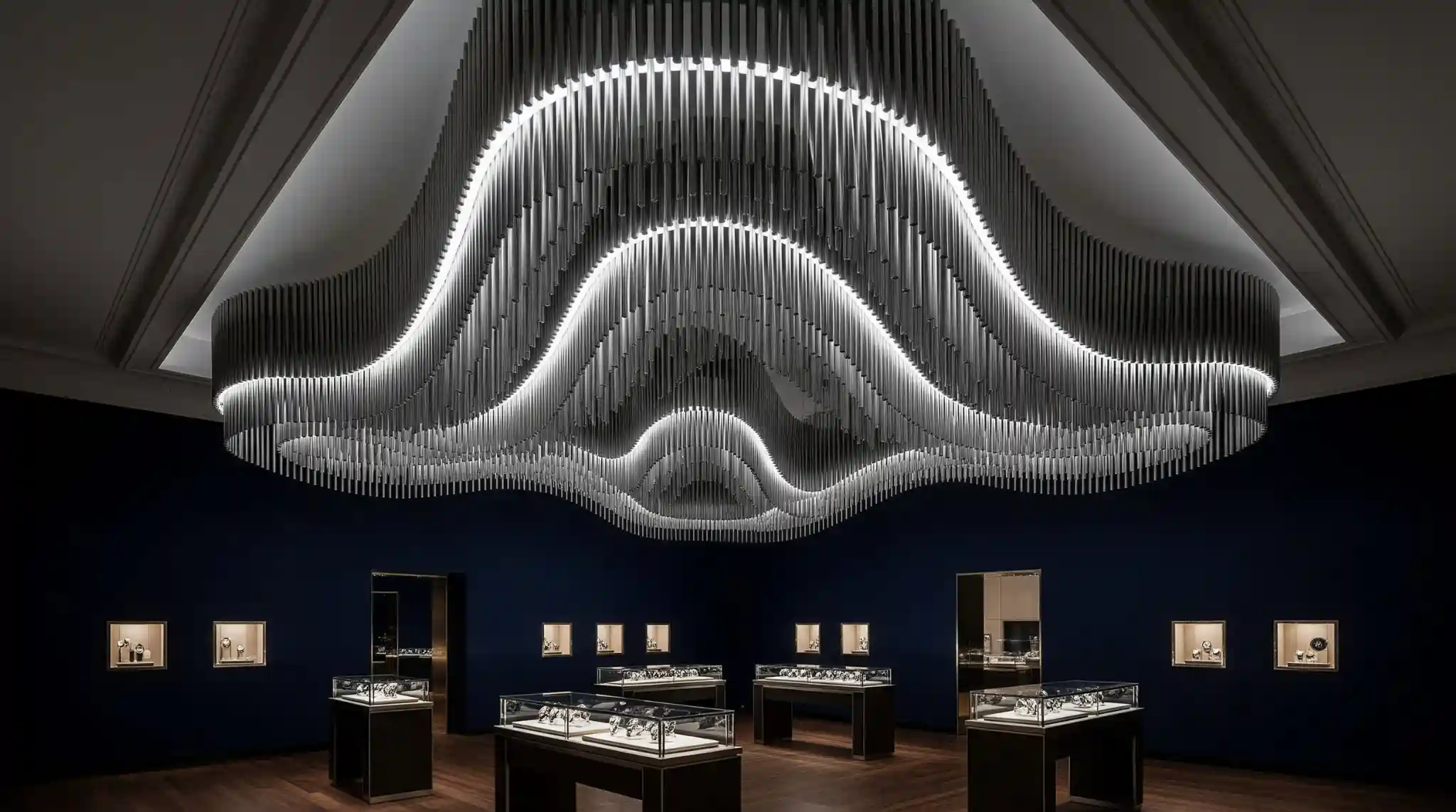 We turned to parametric 3D design. We wrote a script to generate a wave-like form made of 3,000 individual lightweight aluminum fins. Because the design was parametric, we could instantly adjust the density and depth of the fins in the 3D software to optimize the weight. We simulated the lighting fall-off to ensure the watches in the display cases below would sparkle without glare. The 3D model became the manufacturing blueprint, with every fin labeled and numbered for assembly, turning a complex art installation into a paint-by-numbers kit for the contractor.
