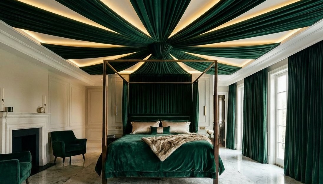 Combine velvet with another fabric like sheer silk or linen. Alternate strips of velvet and strips of the lighter fabric. This breaks up the weight of the velvet. It lets light pass through the sheer parts while the velvet adds texture. This is a great way to save money since velvet is pricey. I recommend a 2:1 ratio of velvet to sheer. It keeps the dramatic feel but adds a bit of breeze. This works well in warmer climates where a full velvet ceiling might feel too hot.